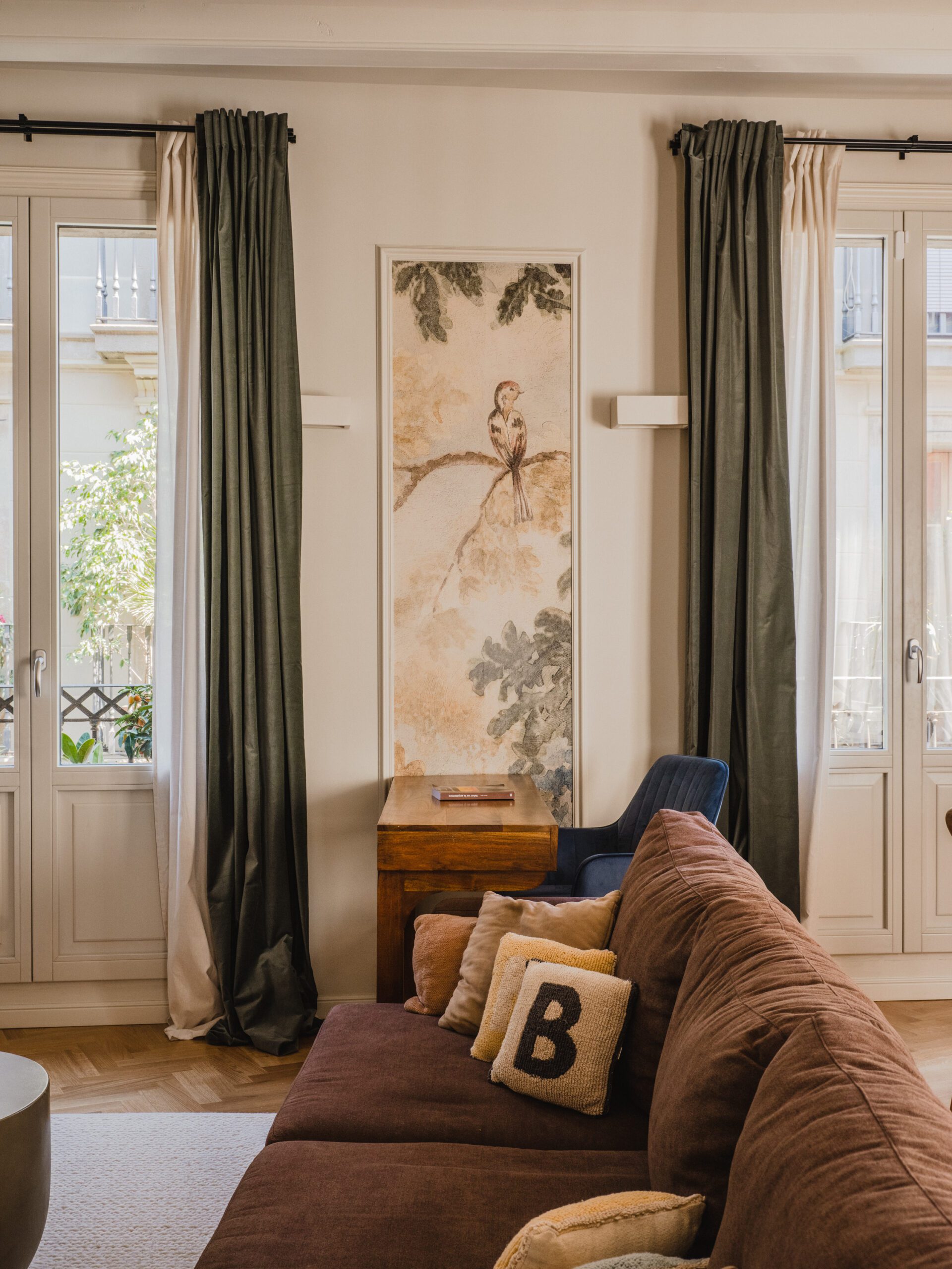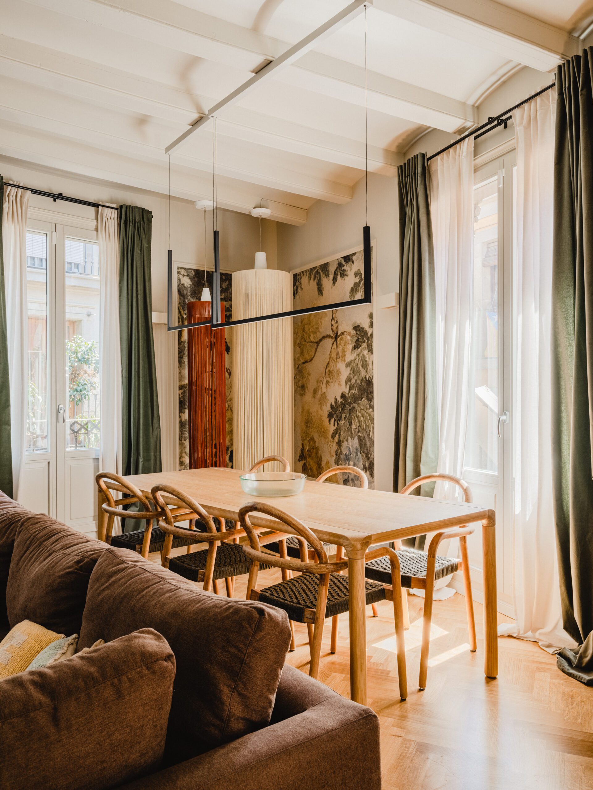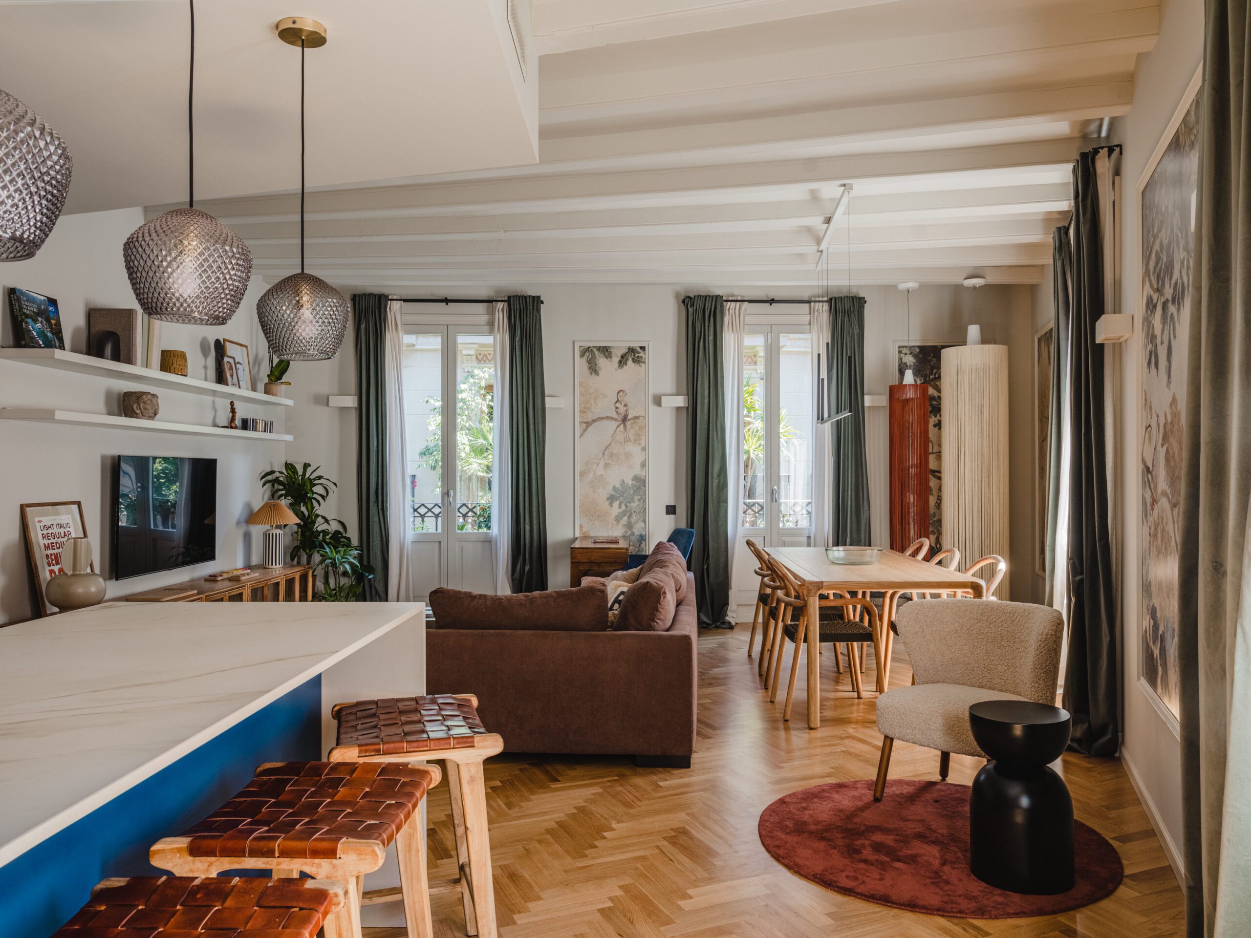 Located in the heart of Barcelona, this cozy apartment interior design is inspired in the romantic background historyof Ciutat Vella. Using quality finishings such as natural wood and white golden marbles, the space becomes warm and timeless. The design adds its sophisticated touches by applying wall painted murals and mouldings in the main living area to merge the indoor with the green outdoor views from its 4th floor balconies.