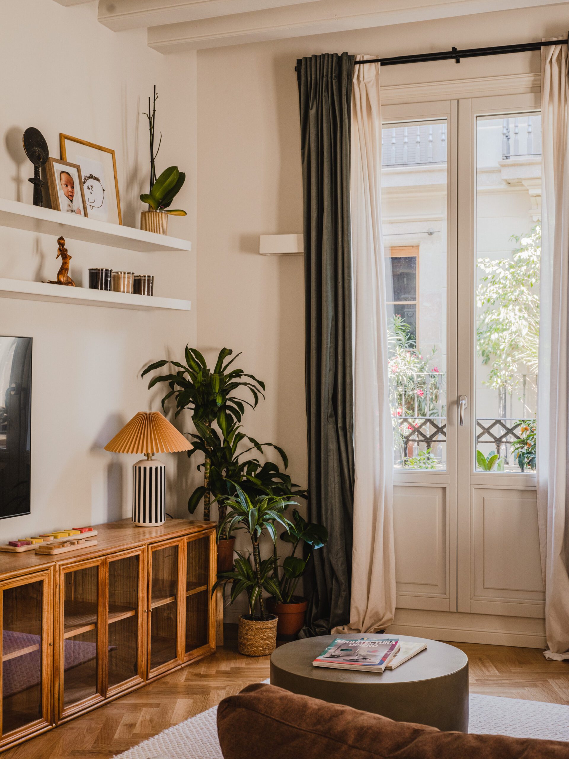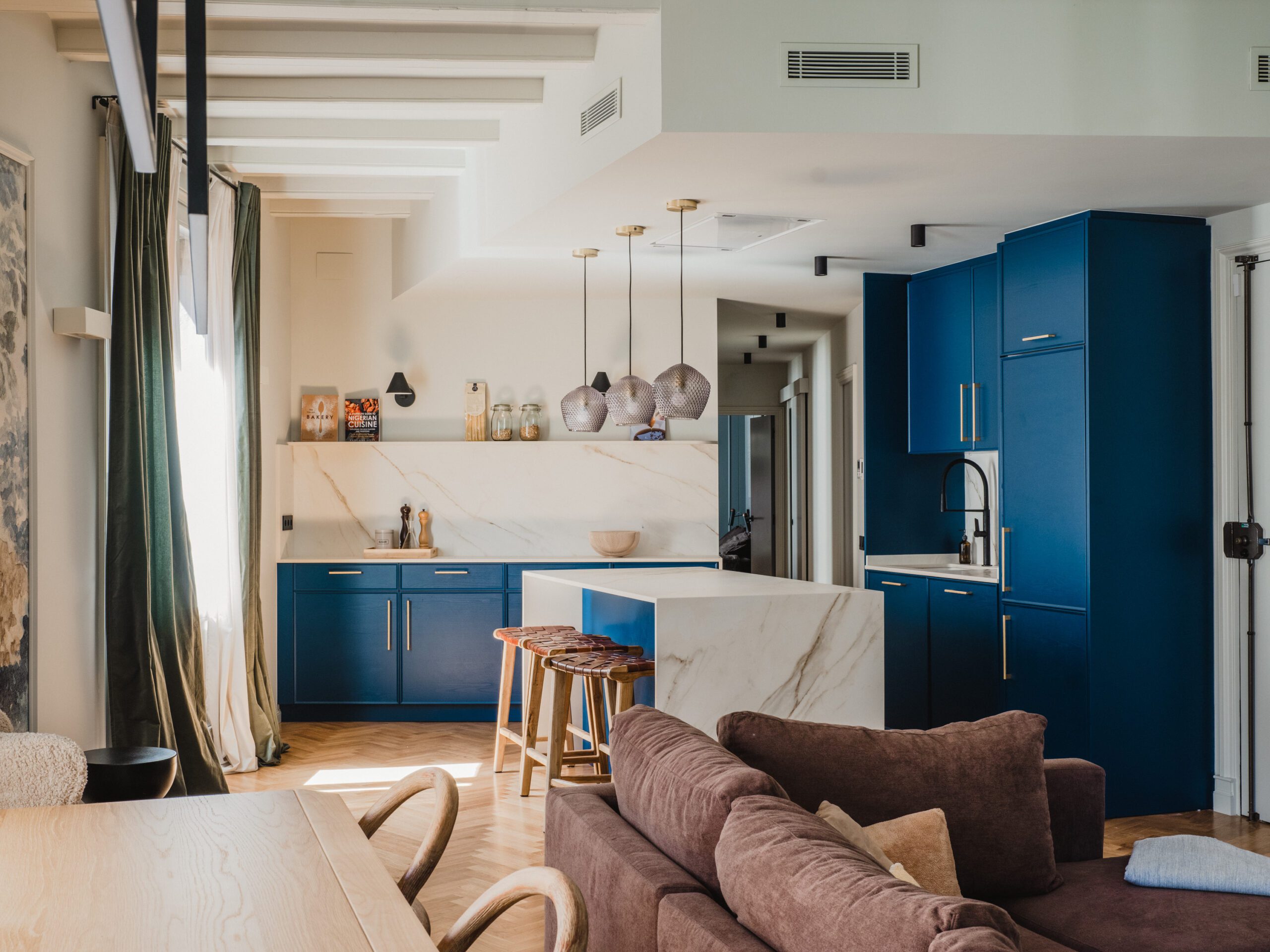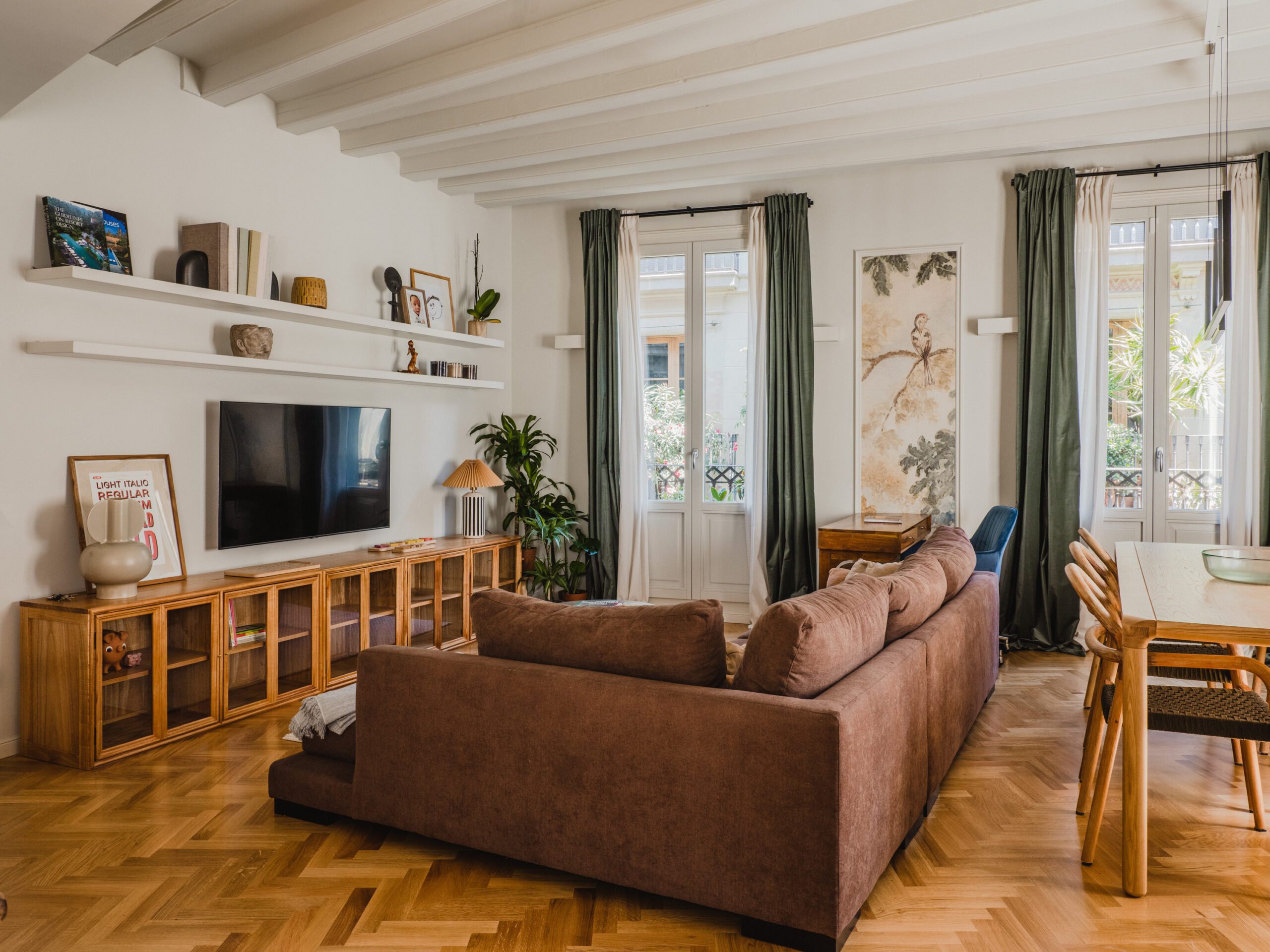 Located in the heart of Barcelona, this cozy apartment interior design is inspired in the romantic background historyof Ciutat Vella. Using quality finishings such as natural wood and white golden marbles, the space becomes warm and timeless. The design adds its sophisticated touches by applying wall painted murals and mouldings in the main living area to merge the indoor with the green outdoor views from its 4th floor balconies.